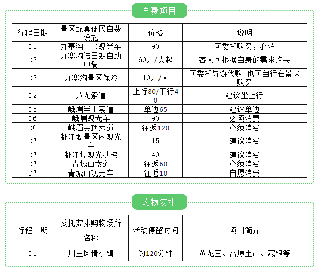 景區(qū)便民設(shè)施,交通保險、行程中約定的自理自費內(nèi)容、酒水、個人消費、景區(qū)內(nèi)索道、沿途小門票、行程中備注未含的餐及住宿等!請當(dāng)?shù)噩F(xiàn)付,備有說明除外。
