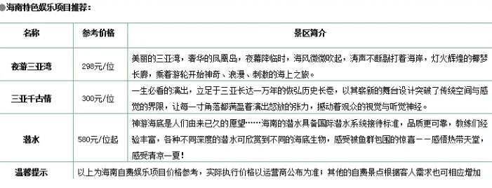 11、海南娛樂活動豐富,潛水、拖傘、香蕉船等;除了我們行程中包含的景點外,您在景區(qū)自由活動休息的時候也可以自行參加另付費娛樂項目(價格請參考上頁自費項目表和掛牌價)。并提前告知,由導游根據最佳時間進行合理安排,不給旅游留下遺憾。