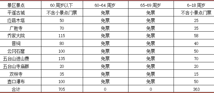 8、景點小交通另外收費(自愿):云岡石窟20元/人,懸空寺登臨(60周歲以上免)100元/人;不含平遙小景點門票125元/人